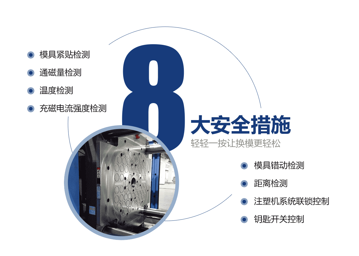 電永磁磁力模板大大提高注塑機(jī)換模效率。 自動化注塑機(jī)的換模方法僅需3分鐘即可完成。特大型注塑機(jī)模板的換模時間從超過2小時減少到10分鐘。
